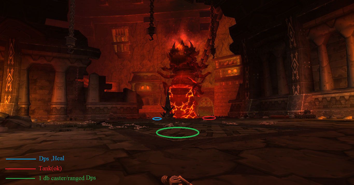 A healek és Dps-ek(1 kaszter/ranged kivételével)mind a bossunk jobb oldalánál(képen kéknél)szorosan a boss melett állnak,onnan dps-elik a bosst és onnan healelik a raidet.